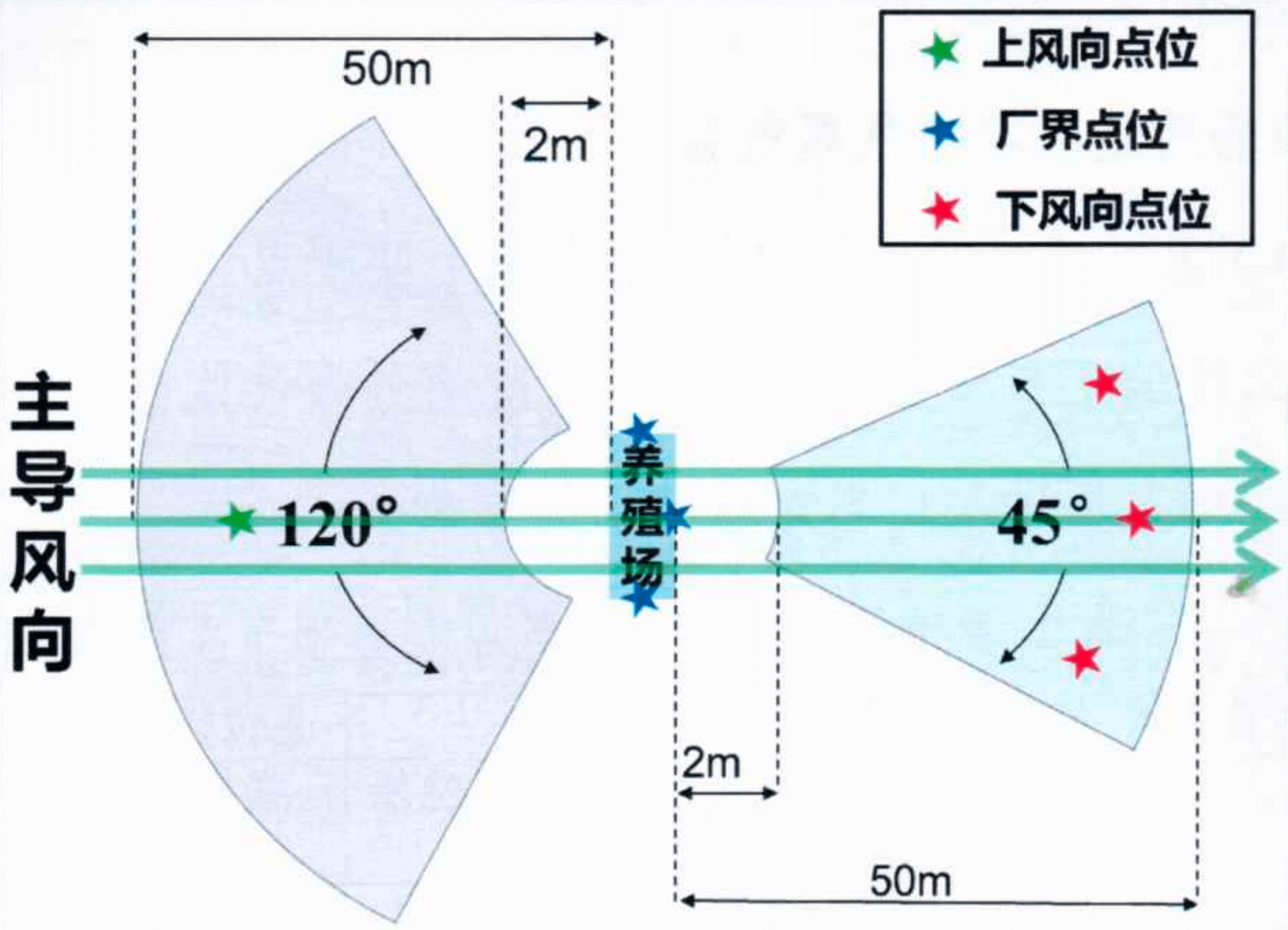 以養(yǎng)殖場(chǎng)主導(dǎo)上風(fēng)向的中線(120°夾角內(nèi),距離養(yǎng)殖場(chǎng)2-50m范圍內(nèi)) |