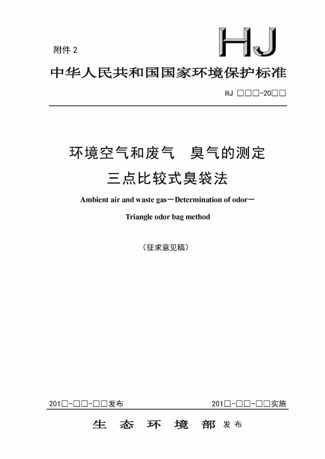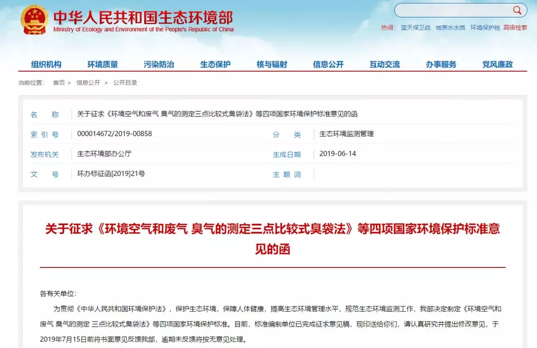 2019年6月14日,生態環境部發布“關于征求《環境空氣和廢氣 臭氣的測定三點比較式臭袋法》等四項國家環境保護標準意見的函”: