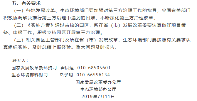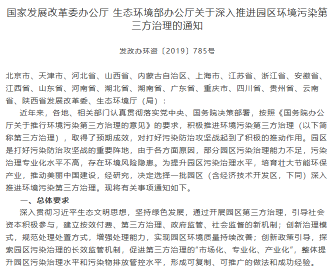 其中,在培育第三方治理新模式方面,《通知》明確提出,園區(qū)依法委托第三方開展治理服務,提供包括環(huán)境污染問題診斷、系統(tǒng)解決方案,污水和固體廢棄物集中處理處置、煙氣治理、污染物排放監(jiān)測以及監(jiān)管信息平臺等環(huán)境綜合治理服務。