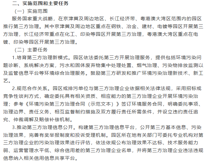 《通知》明確,為服務國家重大戰(zhàn)略,在京津冀及周邊地區(qū)、長江經濟帶、粵港澳大灣區(qū)范圍內的園區(qū)推行第三方治理。其中京津冀及周邊地區(qū)重點在鋼鐵、冶金、建材、電鍍等園區(qū)開展第三方治理,長江經濟帶重點在化工、印染等園區(qū)開展第三方治理,粵港澳大灣區(qū)重點在電鍍、印染等園區(qū)開展第三方治理。