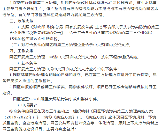 對此,《通知》也在政策支持方面給予明確。即,按照給予符合條件的從事污染防治的第三方企業(yè)減按15%的稅率征收企業(yè)所得稅,對符合條件的園區(qū)和第三方治理企業(yè)給予中央預算內投資支持。