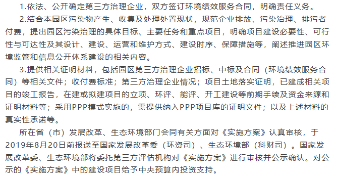 《通知》指出,園區(qū)開展第三方治理申報中央預算內投資支持應符合以下條件,即園區(qū)環(huán)境污染治理有明確的目標和規(guī)劃,已在第三方治理方面進行了初步探索,具備開展深入推進的工作基礎;園區(qū)申報的項目前期工作落實,配套條件較好,項目已開工或者能夠確保按時開工建設;園區(qū)近五年未出現(xiàn)重大環(huán)境污染事故和群體事件。